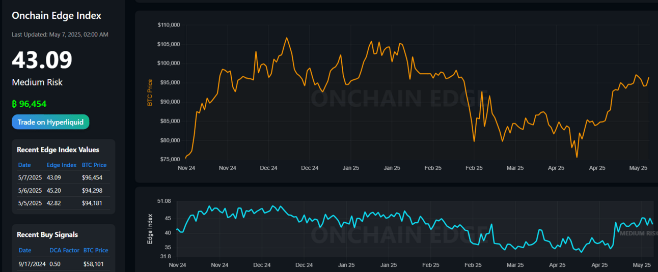 Onchain Edge Index: 43.6 (Medium Risk) → cautious but not euphoric.