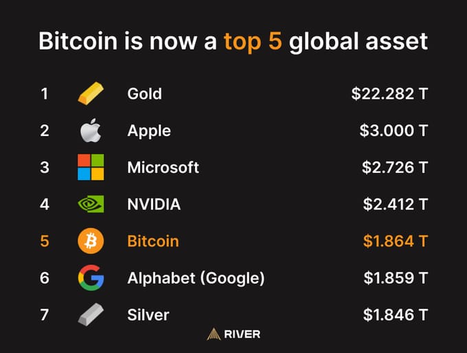 BTC is now a Top 5 global asset — larger than Silver, almost on par with Alphabet.