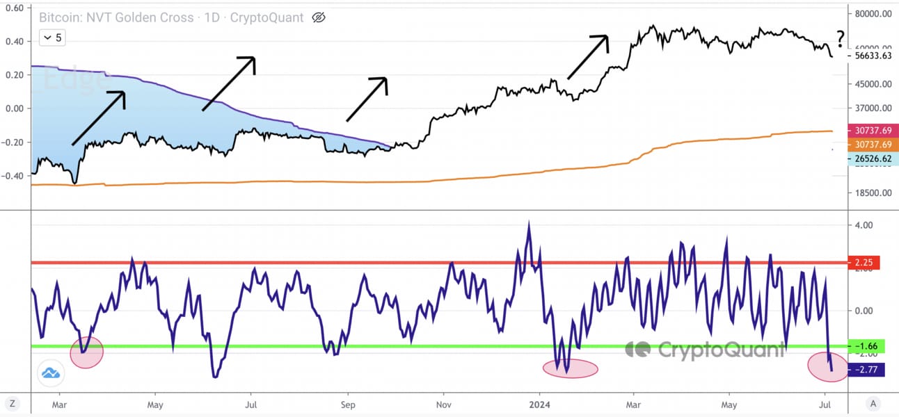The NVT Golden Cross uses on-chain transaction data to provide a more fundamental view of Bitcoin’s valuation.