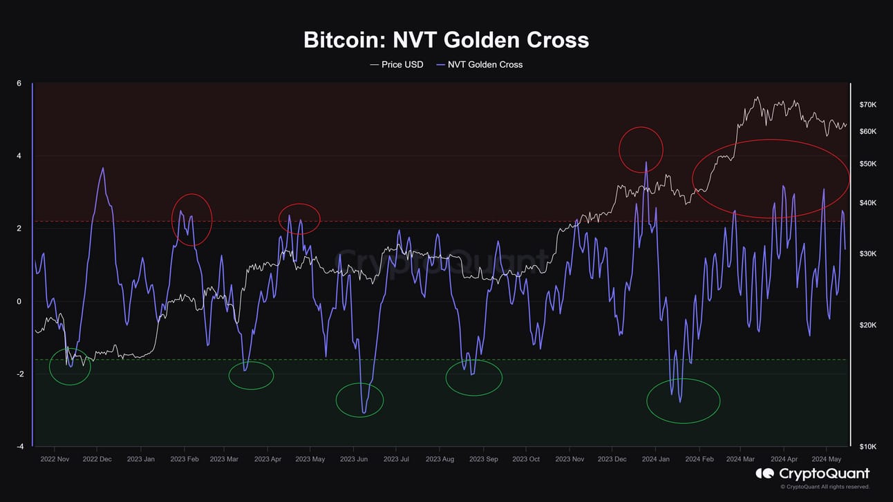 May 2024: Recently, the NVT Golden Cross detected a peak in May 2024. The indicator rose above 2.2, suggesting that Bitcoin was overvalued. This signal helped traders prepare for a potential market correction, and soon after, Bitcoin prices adjusted downward, proving the indicator's effectiveness.