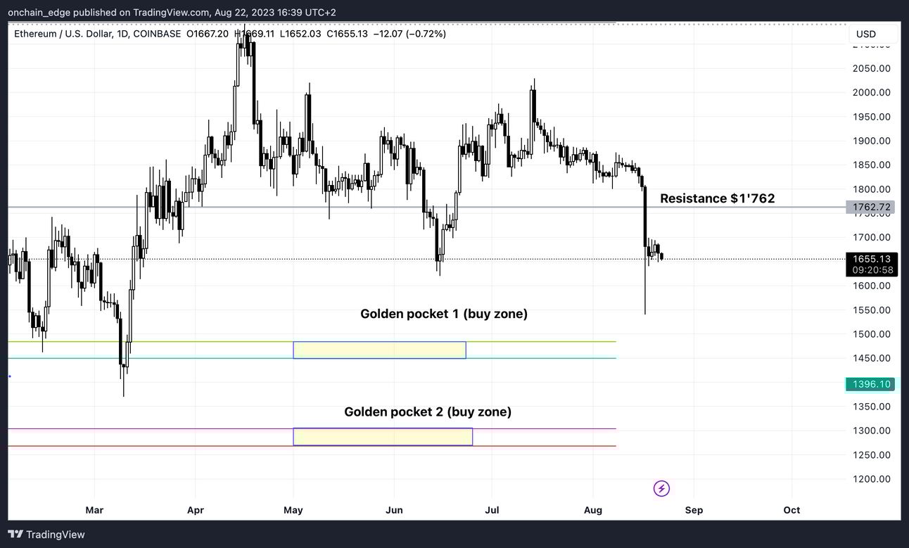 ETH needs to maintain above $1650 to avoid dropping to the Golden Pocket 1 range between $1450 and $1500.