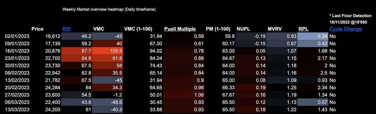 Let’s look at the weekly heatmap with the most critical technical and onchain metrics. RSI is above 50, which is bullish and not yet at an overbought level. VMC is at -40, which is rather good. All the other metrics are steadily increasing with this mini-rally.