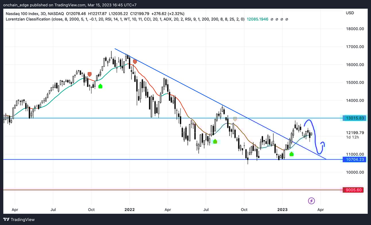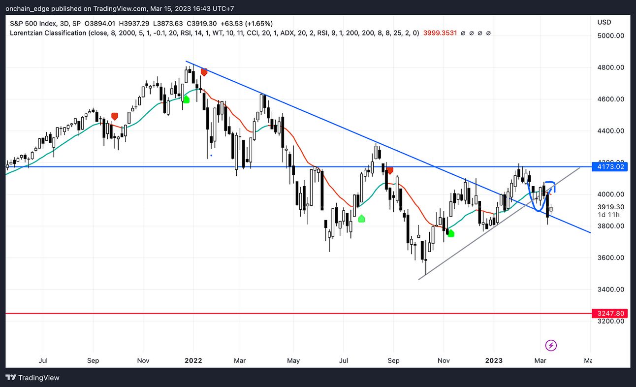 The S&P500 experienced significant volatility at the start of the week, likely caused by several banks' bankruptcy, with SVB being the largest. The S&P500 has retested the downwards-sloping trendline and is now valued at $3.9k. Two possible scenarios could unfold, and the upcoming candle closes will be critical in determining which one.
