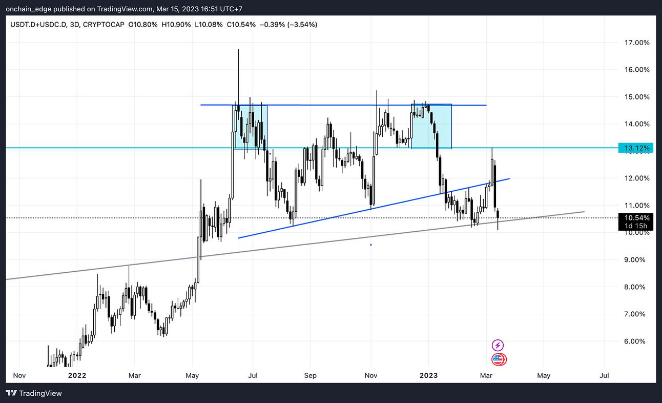 The stablecoin dominance spike to 13% and abruptly dropped to 10.54% as most investors fled USDC due to the depeg.