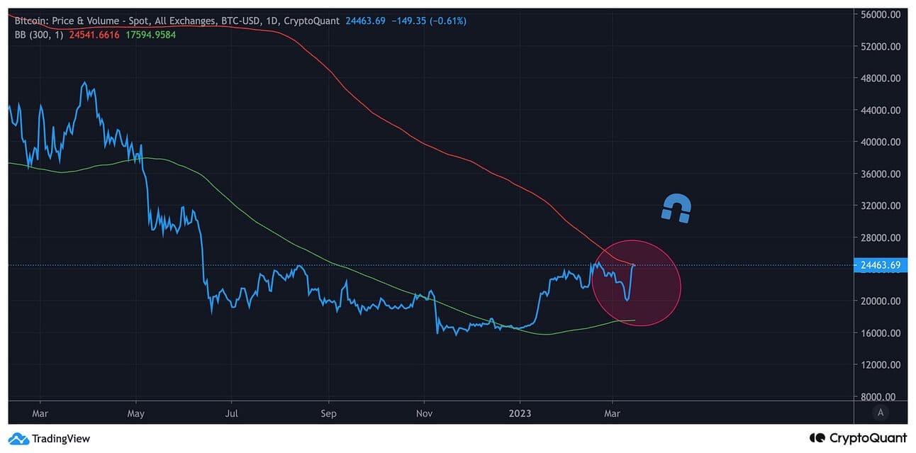 BTC is retesting the upper band (24.4k). If BTC should manage to break out, then it could be a sign of a rally starting. However, a false breakout isn’t off the table, as it has happened numerous times.