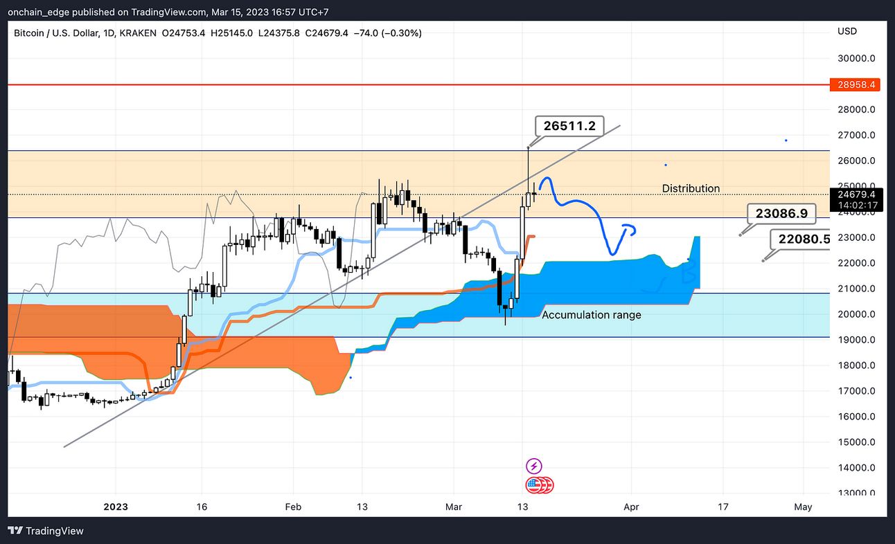 BTC retested the gray, upward-sloping trendline that has acted as support since January and has turned into resistance. Generally speaking, a retest of resistance after a breakdown is called a "kiss&goodbye" and is considered a bearish retest. As a result, I anticipate that the price of BTC will consolidate in the distribution zone. The three critical levels to watch are $23k (support), $22k (support), and $24.7k (resistance).