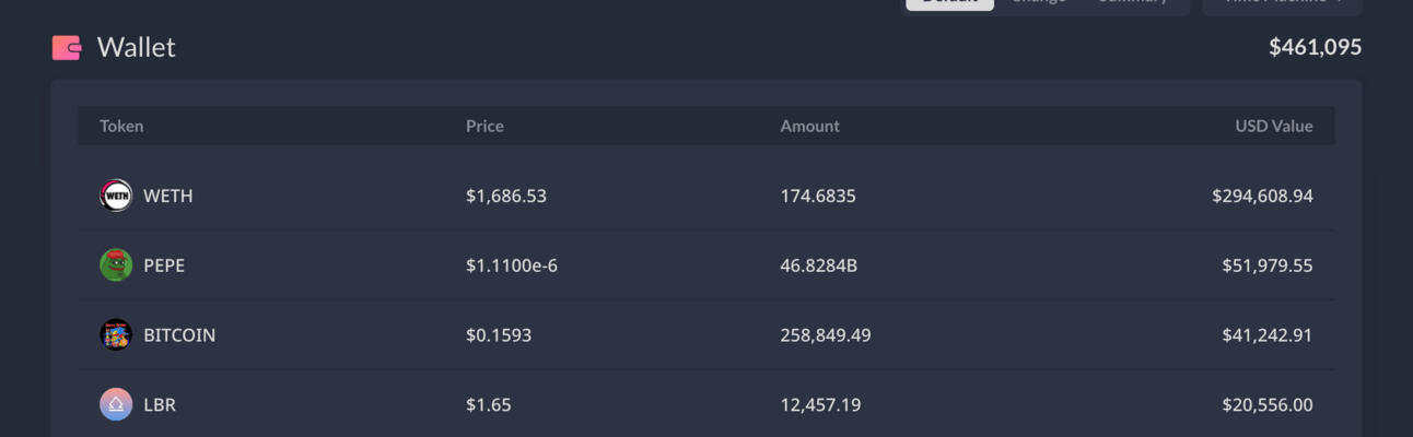Their largest holdings are WETH, PEPE, BITCOIN (not the real bitcoin 😂) and LBR.