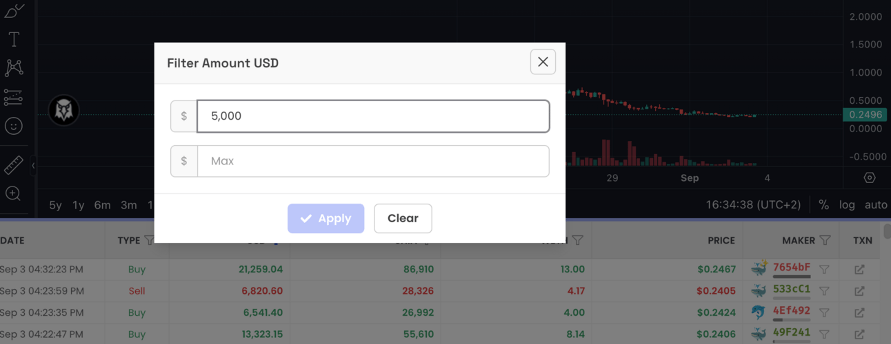 Set Your Filters: Adjust the filter settings to display transactions with a minimum value of $5,000. This will primarily show you the activity of 'whales' and 'dolphins' in the trade section.
