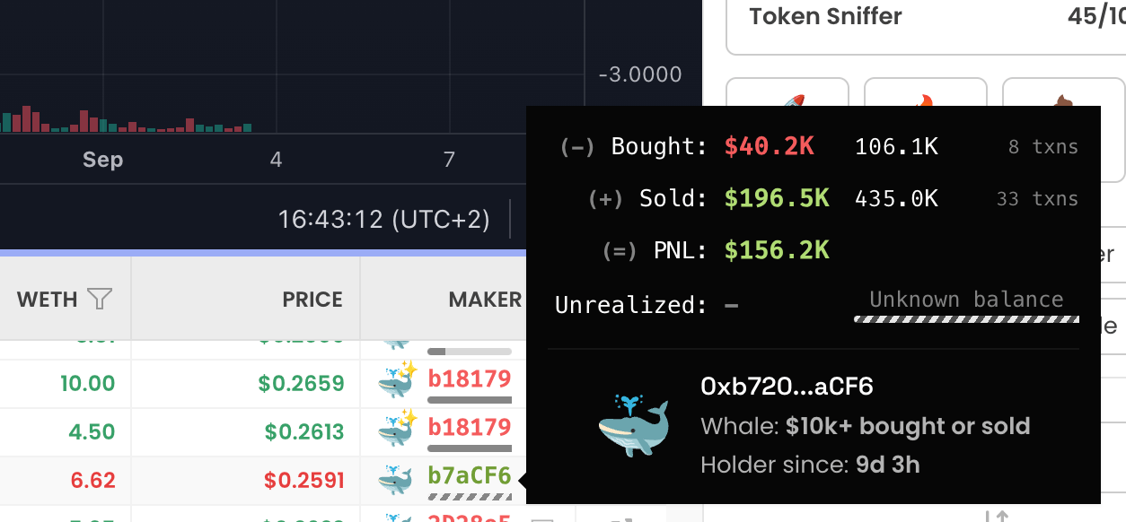 Navigate to the Maker Column: You'll find a list of these prominent traders here. Hover over the maker icon, represented by either a whale or dolphin emoji, to view a detailed breakdown of each wallet's transactions. This includes the amount they've bought, sold, and their respective profit or loss.