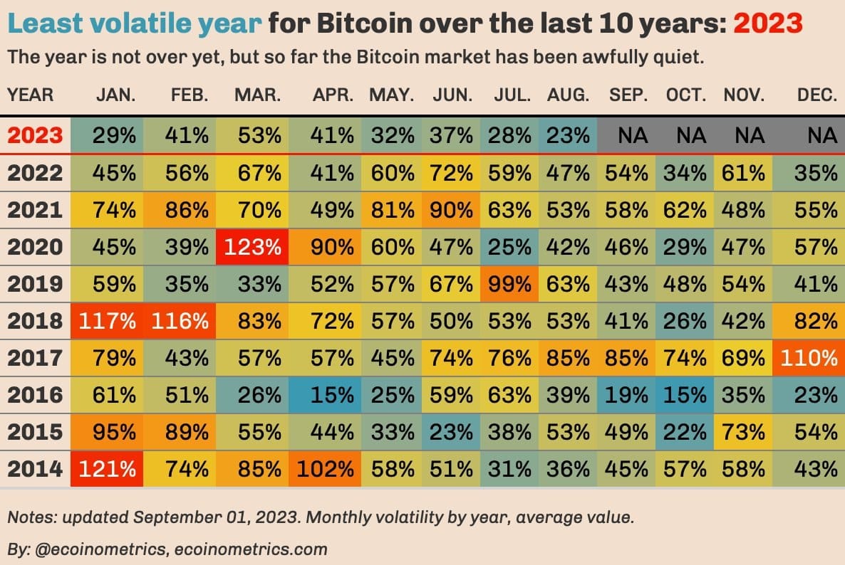 BTC's 2023 Volatility: This year is on track to be one of Bitcoin's least volatile in the past decade. It remains to be seen if the final months will disrupt this trend.