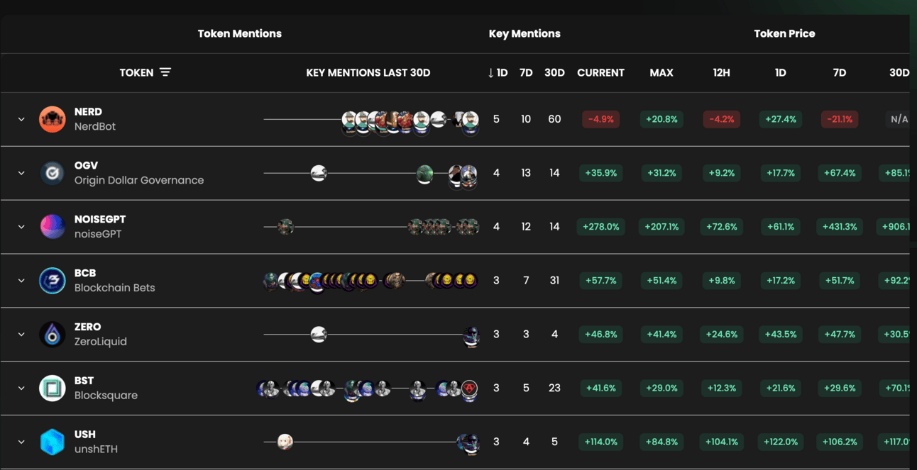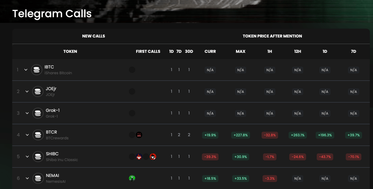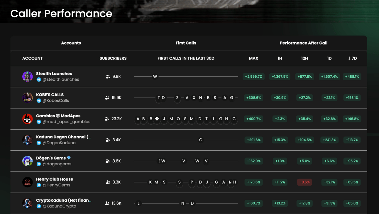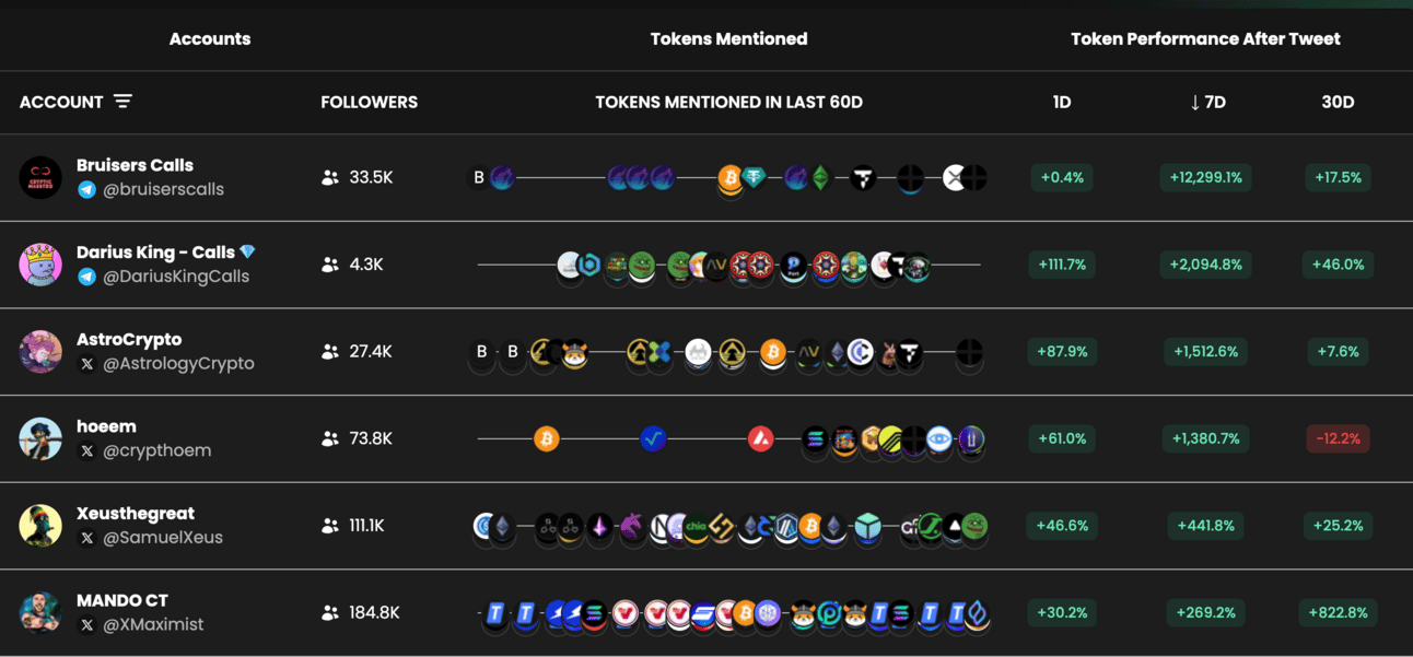 The caller performance dashboard is a nice overview of the best-performing crypto alpha influencers based on the tokens they have mentioned.