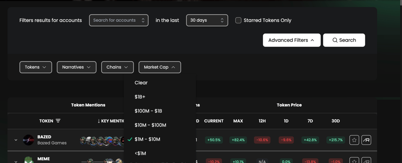 Allows filtering to view tokens mentioned by specific key accounts and their respective mentions. (It's a very nice feature if you want to follow mentions from specific accounts.)