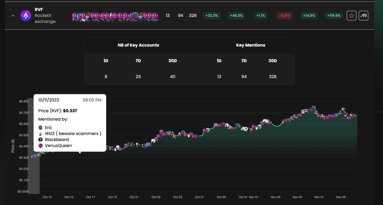 When you click on the small downwards pointing arrow on the left of the token symbol, you can see the token chart with the influencer mentions superposed.