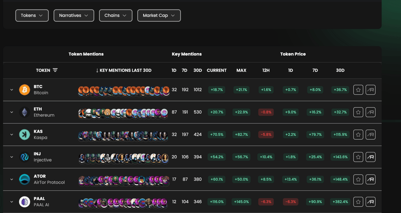 This page shows an overview of what tokens are being mentioned the most.