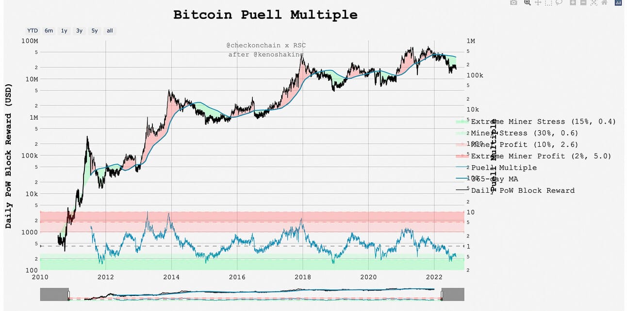 Pull up the Bitcoin Puell Multiple chart on your browser and familiarize yourself with it. You need to focus on the blue graph at the bottom of the chart.